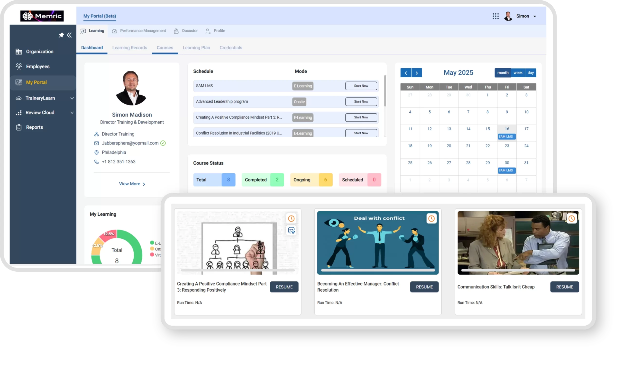 Depending on the solutions your organization uses, employees can access their own employee portal, allowing them to view their profile, learning schedule, training and assigned courses, certificates, compliance status, and more.